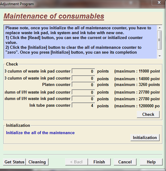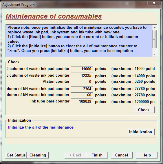 Pour voir les anomalies de l’imprimante, j’ai utilisé un programme spécial www.wasteinkpads.com